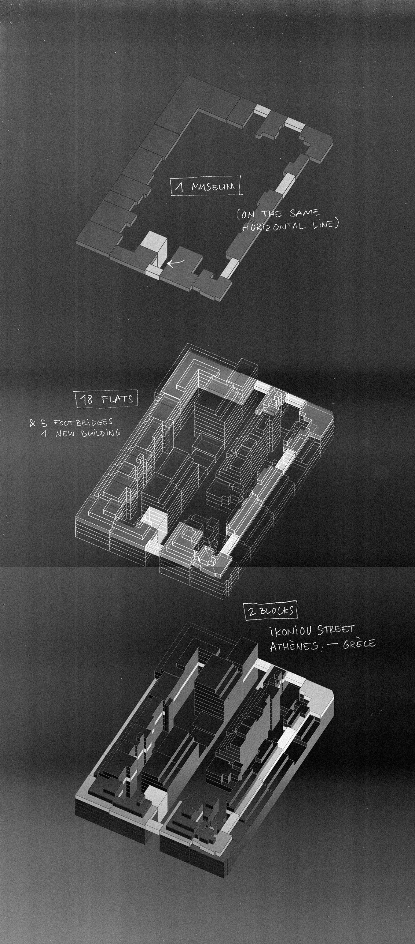 Le tissu bâti d'Athènes est saisissant par la régularité de son aspect chaotique, les règles d’urbanisme ayant fabriqué une ville où les bâtiments se suivent mais ne se ressemblent pas. Cela donne à cette ville une atmosphère particulière et une richesse permise par toutes les surprises et tous hasards que cela suggère. Si bien que pour faire un musée sur cette ville, l’idéal serait de le fondre dans certains de ces îlots pour permettre aux visiteurs de s'immerger dans cette Athènes moderne, loin des sites antiques auxquels se réduit parfois la vision que l’on a de la capitale grecque. L’idée du projet est simple : une ligne horizontale théorique traverse l’îlot et tous les appartements situés sur le même étage. Ces appartements mis bout à bout, reliés par des passerelles ou un percement dans les murs mitoyens (non porteurs le plus souvent à Athènes) formeraient une promenade muséale.
