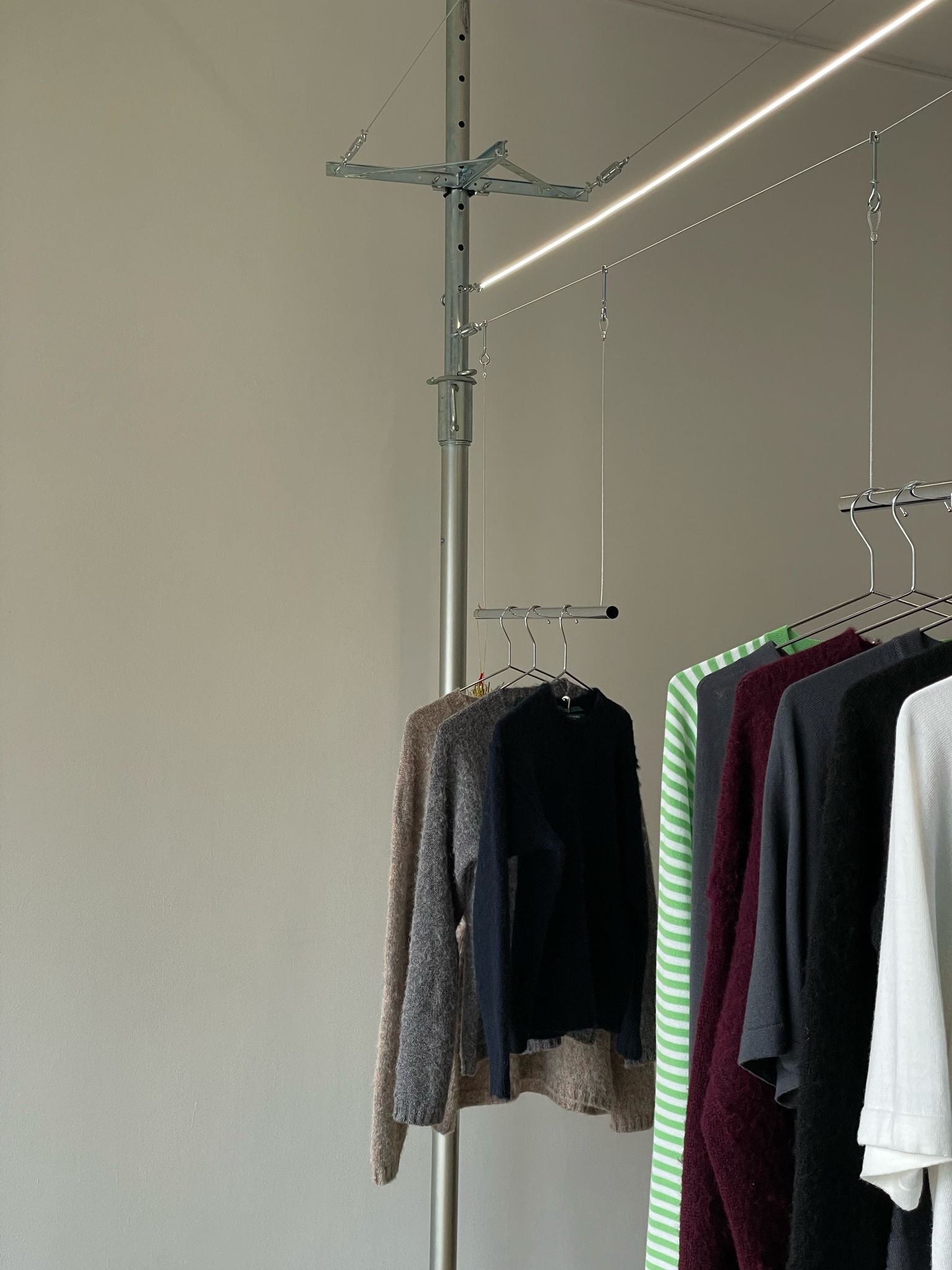 Ce portant pour vêtement à été réalisé pour la marque milanaise E RT KINGDOM, pour son showroom à la fashion week 2024 de Paris. Conçu pour être installé rapidement lors d’évènements éphémère, sont installation s’affranchit de trous, et permet de s’adapter à une grande typologie d’espace sans atteindre son intégrité. Inspiré des pylones de lignes hautes tensions, tous les systèmes d’assemblage sont des jeux de tensions et de compressions. Les vêtements semblent flotter dans les airs. La modularité du système permet de repondre à différent besoins de tailles et de hauteurs.
