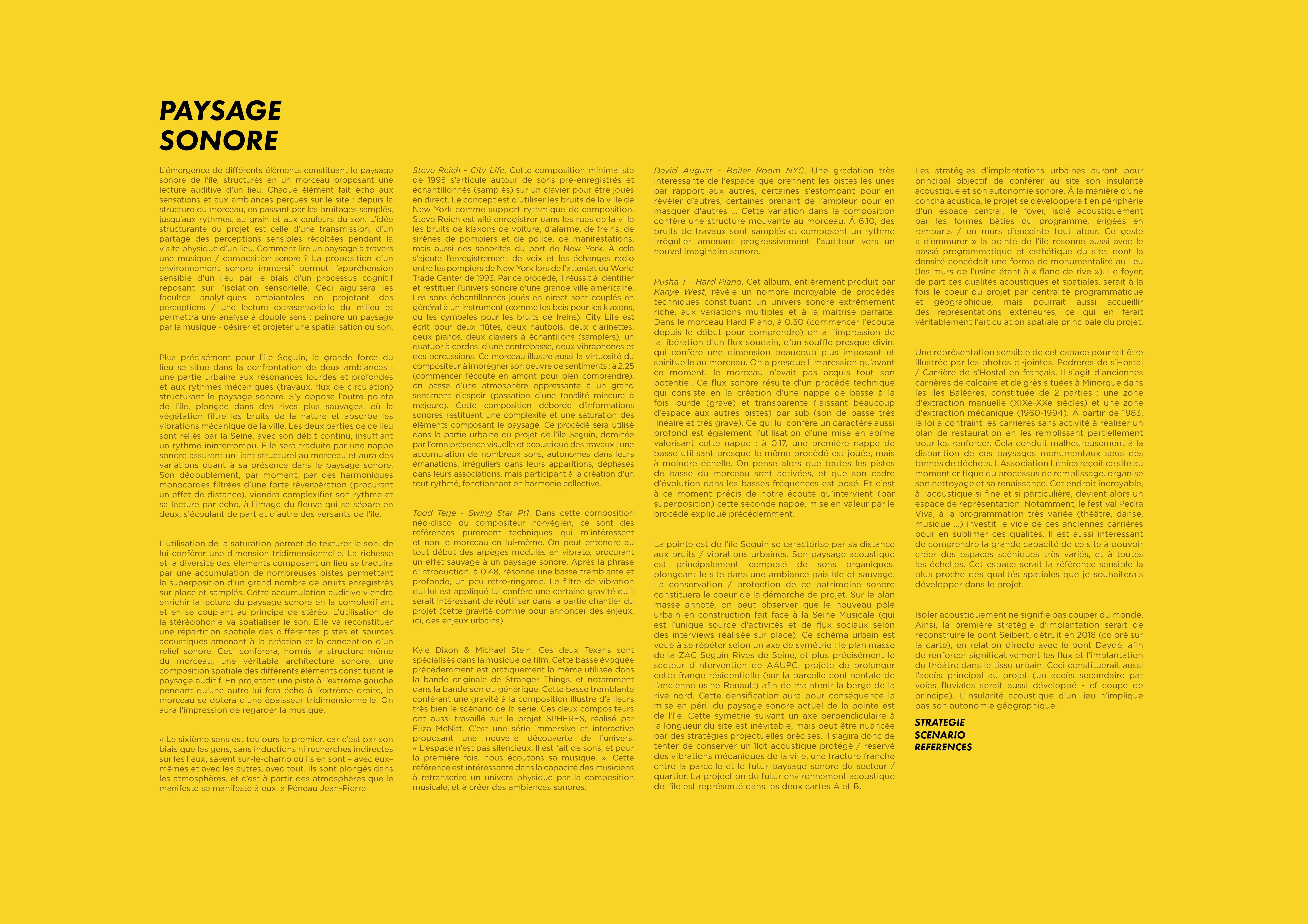 L'émergence de différents éléments constituant le paysage sonore de l’île, structurés en un morceau proposant une lecture auditive du lieu. Chaque élément fait écho aux sensations et aux ambiances perçues sur le site : depuis la structure du morceau, en passant par les bruitages samplés, jusqu’aux rythmes, au grain et aux couleurs du son. L’idée structurante du projet est celle d’une transmission, d’un partage des perceptions sensibles récoltées pendant la visite physique d’un lieu. Comment lire un paysage à travers une composition sonore ? La proposition d’un environnement sonore immersif offre une lecture sensible d’un milieu et permet une analyse à double sens : peindre un paysage par la musique - désirer et projeter une spatialisation du son.