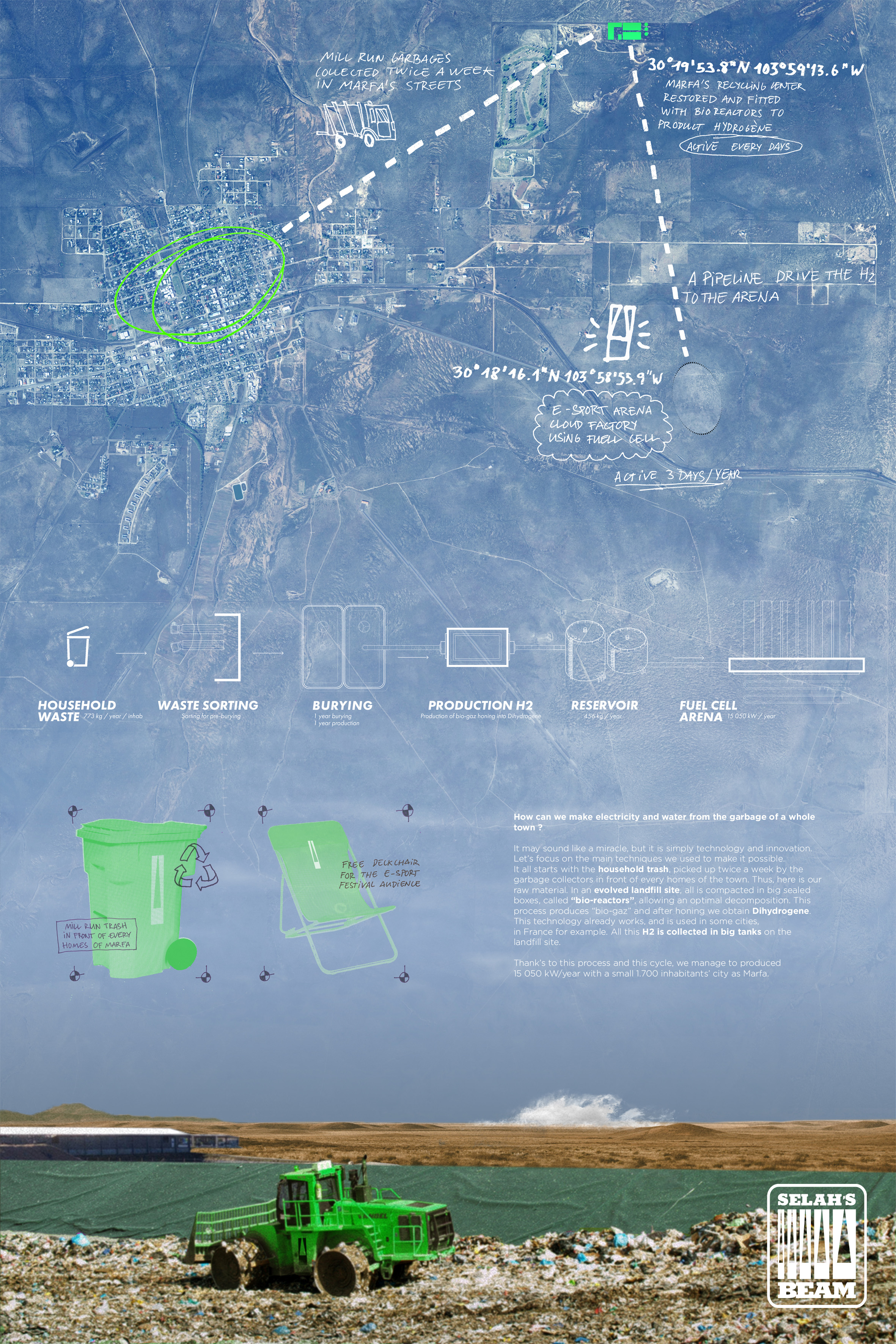 À Marfa, une petite ville du désert texan, les déchets ramassés dans les rues sont transportés jusqu'à une station de traitement. Ce qui n'est pas recyclable est placé dans des cuves de fermentation appelées "bio-réacteurs". La décomposition des déchets produit ainsi de l'hydrogène qui alimente plusieurs dizaines de totems massifs.